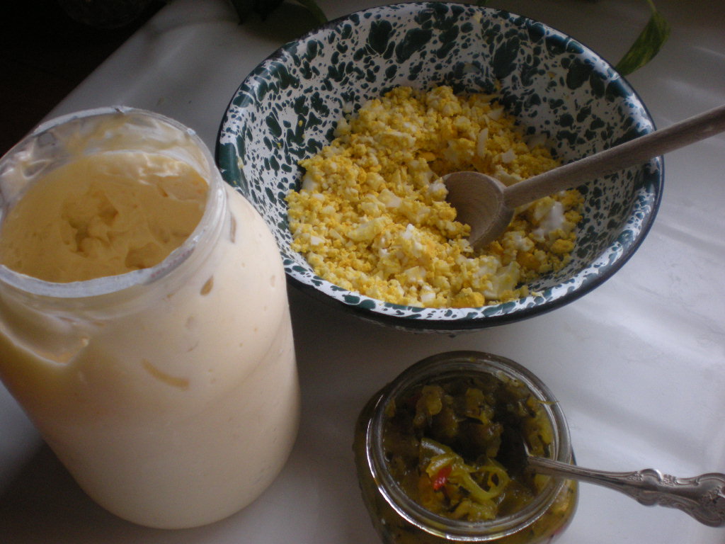 I've been making egg salad for my whole life it seems. My Mother used to make egg salad and tunafish (solid white only!) sandwiches for dinner sometimes when she was real busy creating outfits in the sewing room with my Grandmother. She made them on white bread and cut the crusts off and cut them all perfectly on the diagonal. There would be a big plate of them in the fridge 1/2 and 1/2 covered with saran wrap. We LOVED it! That soft white bread and the soft filling mmmm you could eat so many and it was fun too. Later on (when I was a newlywed and subsequently a new Mother) she and I would have lunch together all the time and we'd have them on toasted bread and she'd put like 4 layers of green or red leaf lettuce and we'd have Hellmans on one side of bread and Miracle Whip on the other side- ready at exactly 1pm and we'd watch All My Children. Ahhh those were the days! She's gone now and I never eat an egg salad or tuna sandwich without thinking of her. Today I made the egg salad with my own eggs. I got my own chickens in April and had a personal vow not to love them. I was absolutely positive that it would be a disaster and that the dogs would eat them or the hawks would get them or something horrid. Well it's November and all 10 are thriving. I love them. I love their beautiful pure whiteness. I love their little noises. When I pull in the driveway and get out of my truck they come a runnin'- all ten of them like a bunch of puppies or something. Ten little white friends that love me. Their feathers are like angels wings, their beauty blows my mind. They are a dream come true. I have ALWAYS wanted fowl in the barnyard but was always too afraid to try. Today the horses were out loose grazing in the yard with the chickens all around them. It warms my heart!!! It's like the lion laying down with the lamb type of thing. Peace in the kingdom....And then there's the eggs! sometimes 10 a day! All the baked goods in the bakery seem much more special. The color of the cheesecakes and yellow cakes is amazing. Sharing them is amazing! -and simply making egg salad with them is amazing! Standing at the kitchen sink peeling them hard boiled- seeing them and feeling them in a whole different way. Wishing Mom was here to share it. Feeling nostalgic over egg salad! I mixed in a little of my homemade "Aunt Margie's Zucchini relish too.YUM!